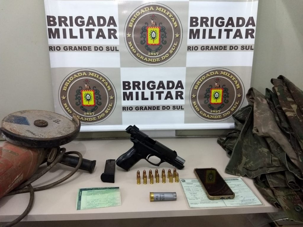 No interior da camionete, foram localizados cinco conjuntos de farda camuflada modelo militar e uma esmerilhadeira de grande porte, mais um cartucho deflagrado de espingarda calibre 12 e um celular. Diante dos fatos, foi dado voz de prisão ao indivíduo e após, ele foi conduzido a UPA e DPPA. O indivíduo possui antecedentes por adulteração de sinal identificador de veículo e receptação.