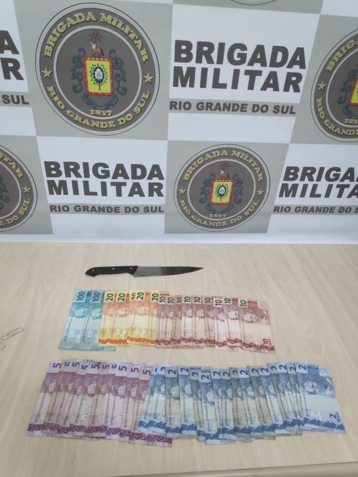 Um homem foi preso após um roubo a estabelecimento comercial por volta das 14h11 desta terça-feira (23/2) em Estrela. A guarnição da Brigada Militar foi informada sobre um homem branco de bermuda e moletom preto, que entrou em uma loja com uma faca, se aproximou da gerente e pediu o dinheiro do caixa. Segundo a vítima, o autor pegou todo dinheiro do caixa e fugiu do local a pé. Após buscas, ele foi localizado, já sem o moletom. Após abordagem e identificação, foram localizados com ele R$ 472, e confessou ter roubado o estabelecimento. A vítima reconheceu o indivíduo. Ele informou que se desfez da faca e do moletom, que foram localizados posteriormente. Ele foi algemado e preso, conduzido ao HPS e posteriormente apresentado na  DPPA de Estrela.