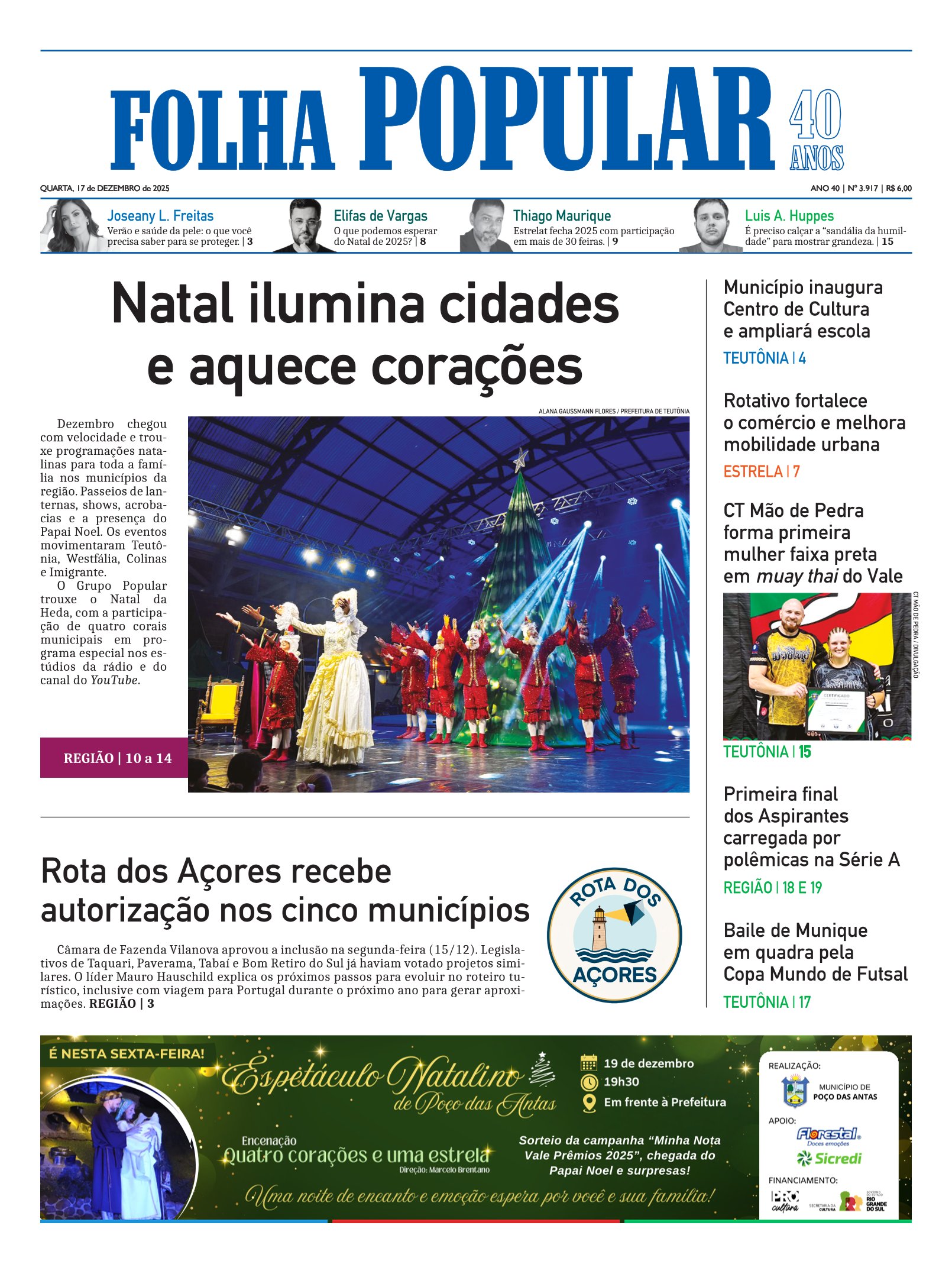 Na edição impressa e digital da Folha Popular desta quarta-feira (17/12), você confere: Natal ilumina cidades e aquece corações. Rota dos Açores recebe autorização nos cinco municípios. Teutônia inaugura Centro de Cultura e ampliará escola. Rotativo fortalece o comércio e melhora mobilidade urbana em Estrela. CT Mão de Pedra forma primeira mulher faixa preta em…