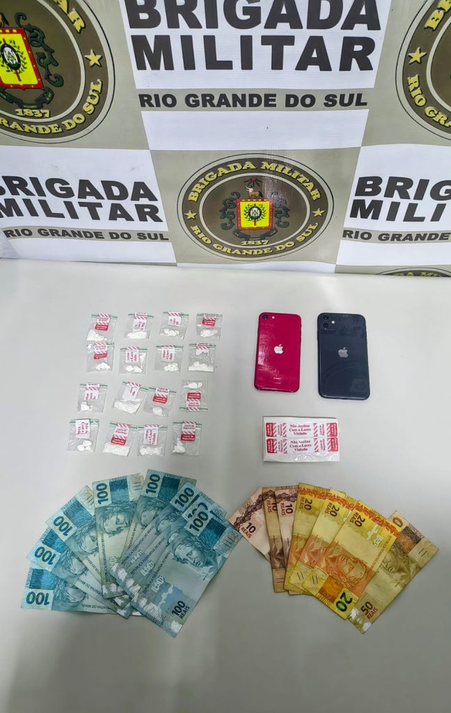 Durante a abordagem a um veículo, os policiais localizaram 16 porções de cocaína, R$ 940 em dinheiro e dois telefones celulares.
