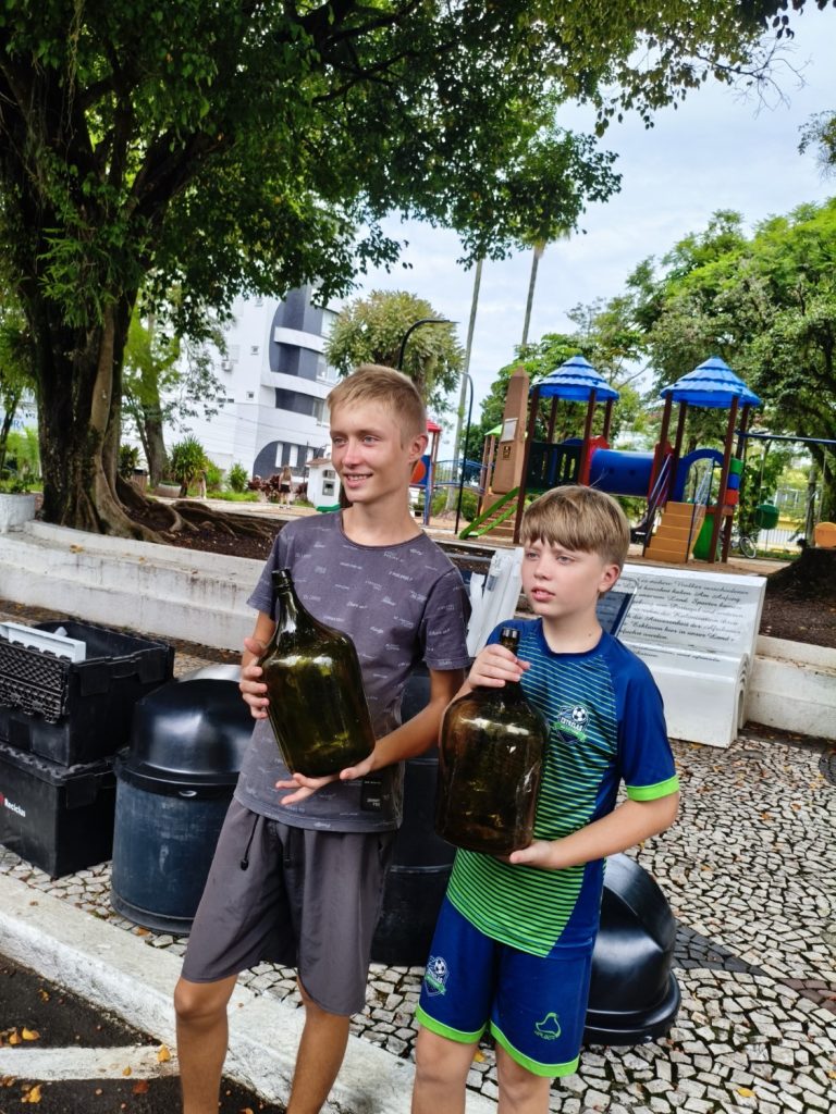 Os irmãos Nicolas e Arthur também ajudaram a mãe a trazer diversos materiais, inclusive garrafões antigos de vinho.