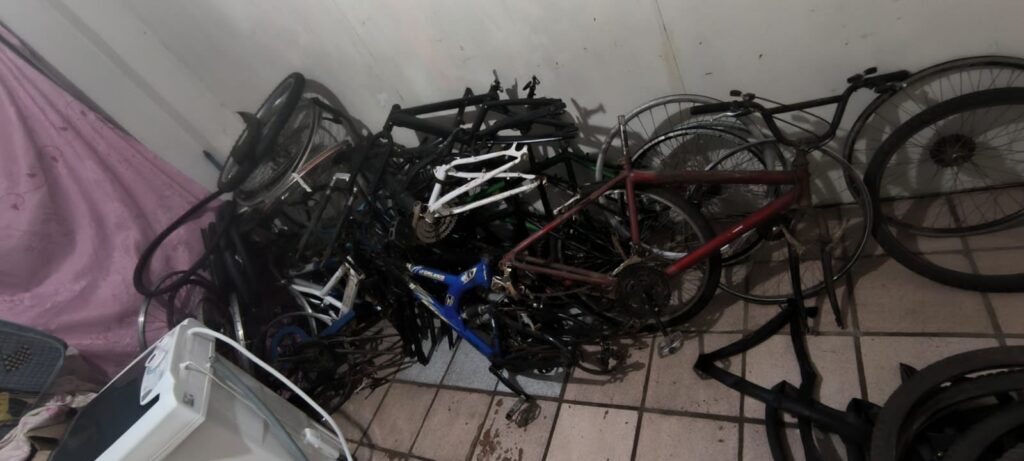 Durante a ação policial, os militares localizaram uma bicicleta que havia sido furtada e, ao verificarem o local, encontraram aproximadamente 29 bicicletas, entre completas e incompletas, além de diversas peças, todas com suspeita de origem em furtos.