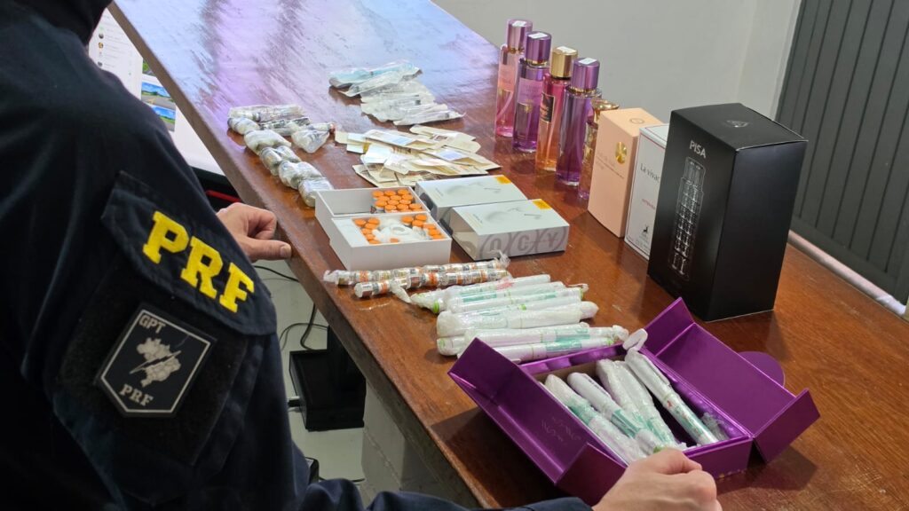Foram apreendidas 55 ampolas de substâncias conhecidas como canetas emagrecedoras, além de uma ampola de anabolizante à base de testosterona e outras duas de peptídeos. Todos os produtos são de origem estrangeira e de uso controlado, com entrada irregular no país.