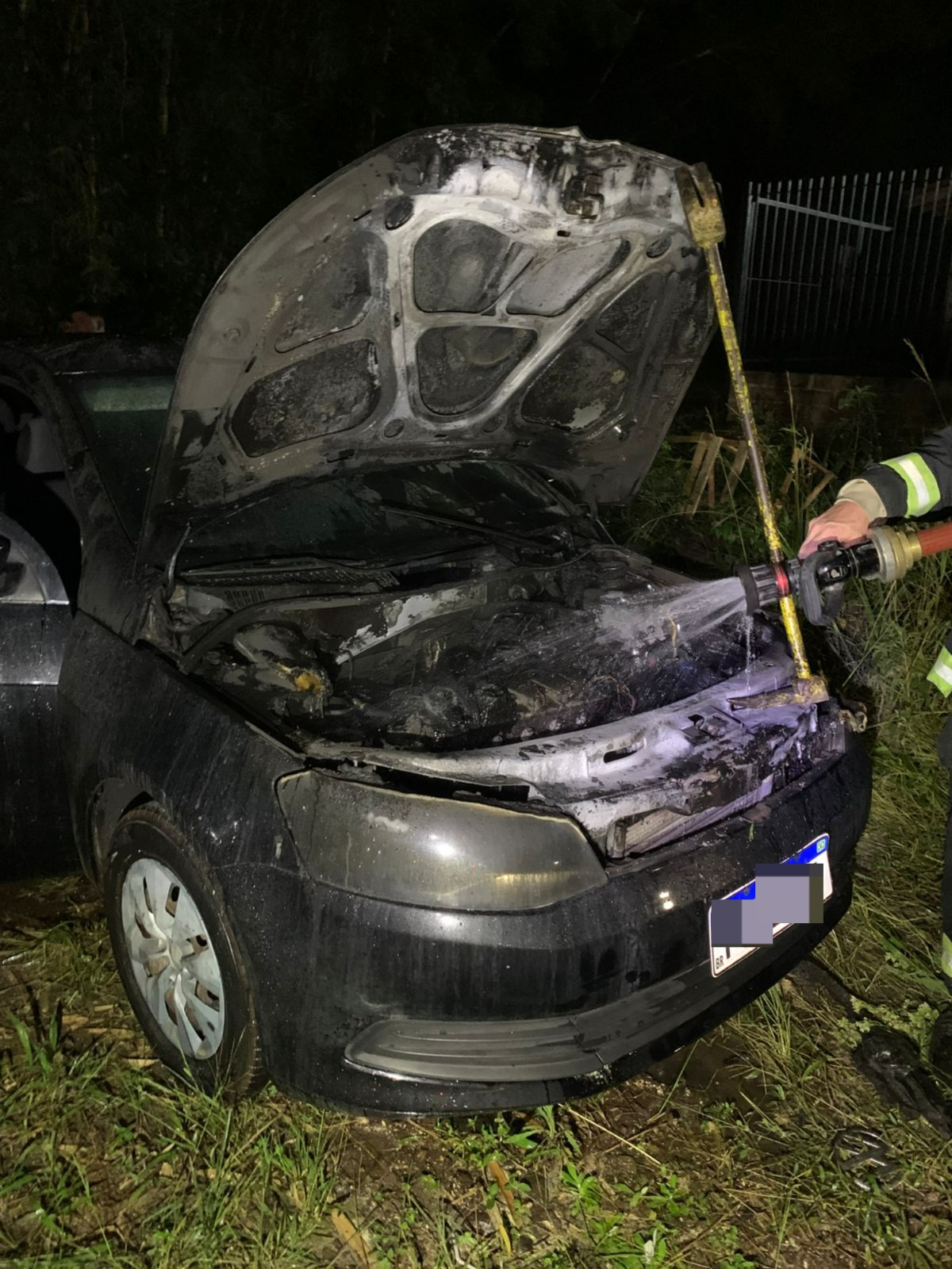 No local, as chamas estavam concentradas no motor de um Volkswagen Voyage preto. Os bombeiros realizaram o combate direto ao fogo, seguido da abertura do capô e do rescaldo do motor.