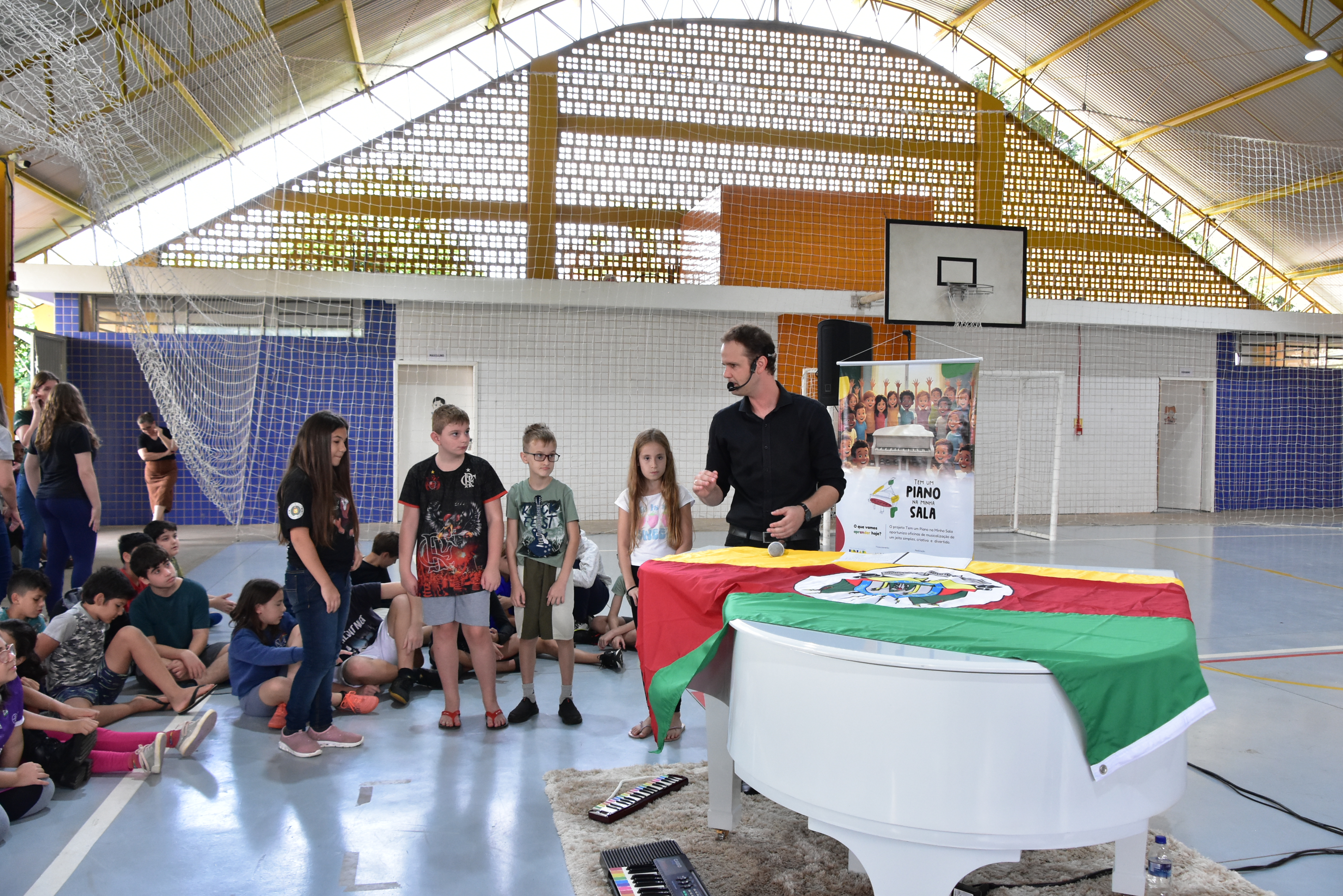 O grande destaque da visita foi o piano branco de cauda instalado no ginásio da Emef Arco Íris. O repertório reuniu clássicos do folclore e do tradicionalismo gaúcho, intercalado com histórias sobre a trajetória do maestro e momentos de participação da plateia.